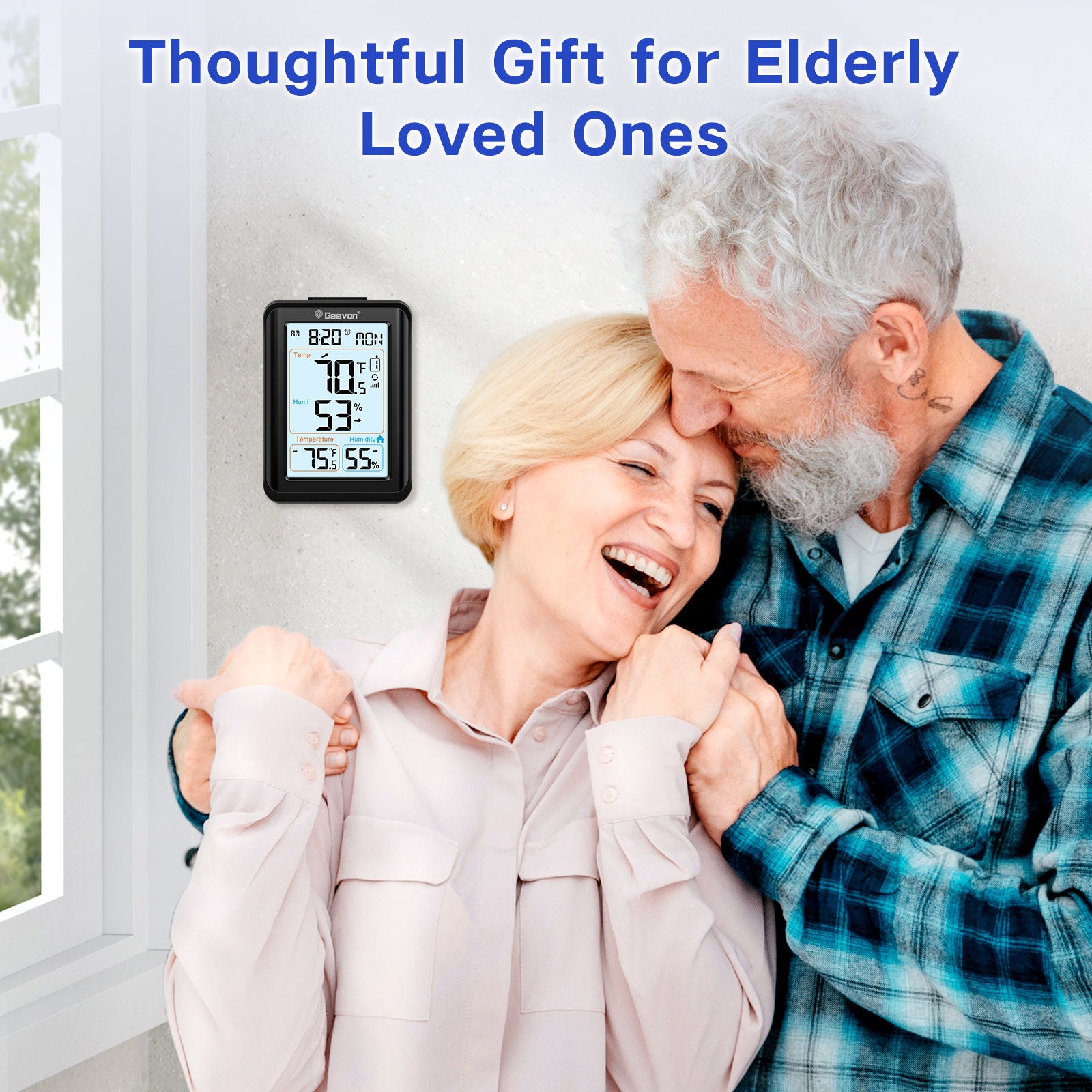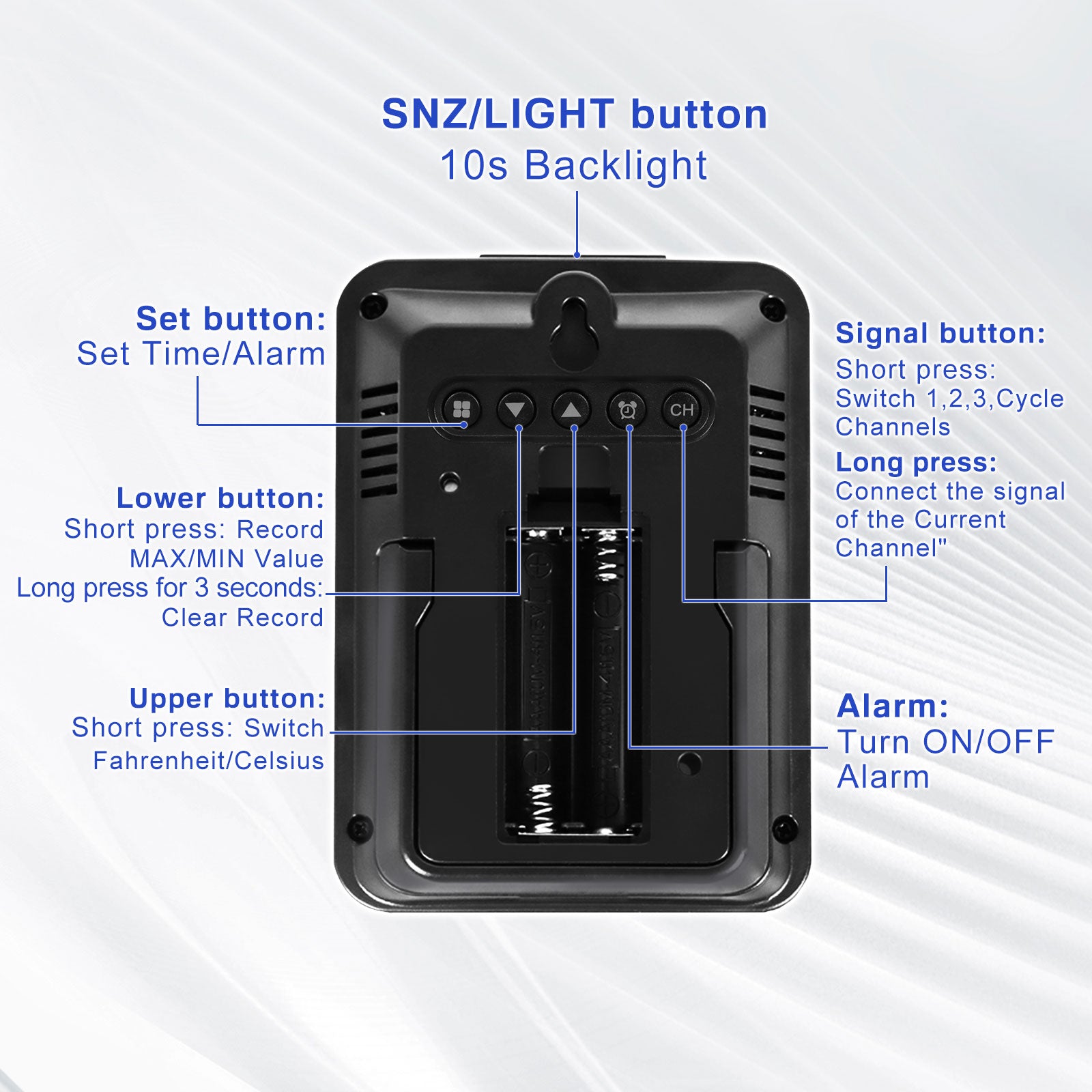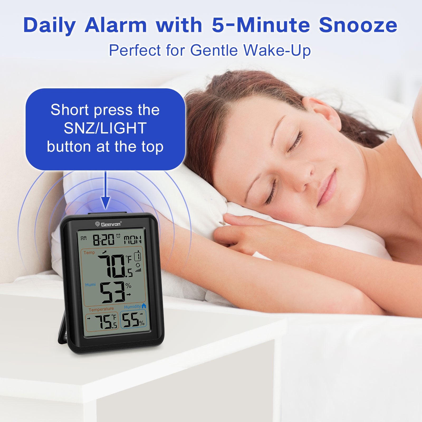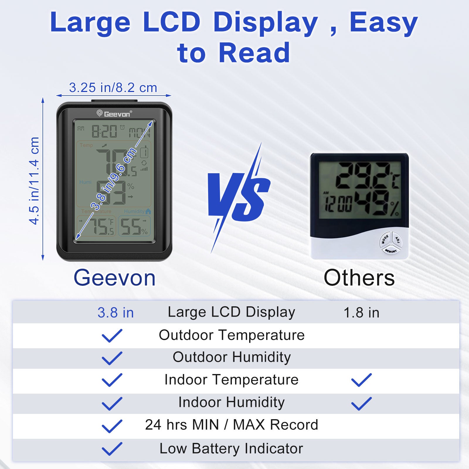 Geevon indoor outdoor thermometer digital wireless features a 3.8-inch LCD screen with a clean layout and bold, easy-to-read digits. The digital thermometer monitors indoor temperature and humidity in real time, plus outdoor temperatures for up to 3 separate locations (includes 1 sensor only). The indoor outdoor thermometer also integrates a built-in alarm clock with a gentle beep and a 5-minute snooze function. For nighttime use, a soft 10-second blue backlight allows easy reading without disturbing sleep. The indoor outdoor temperature is powered by two AA batteries (not included), making it portable and suitable for both desktop use and wall mounting. The wireless outdoor thermometer offers the flexibility to switch between Celsius/Fahrenheit and 12/24-hour formats, records daily high/low temperatures and humidity, and uses intuitive up/down arrows to indicate rising or falling trends.